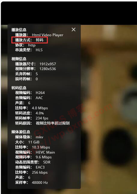 17、再看播放信息,播放方式已经从“直接播放”变成“转码”,转码帧率高达234fps,看来零刻EQ13这台迷你主机这枚N200的CPU还是挺优秀的;