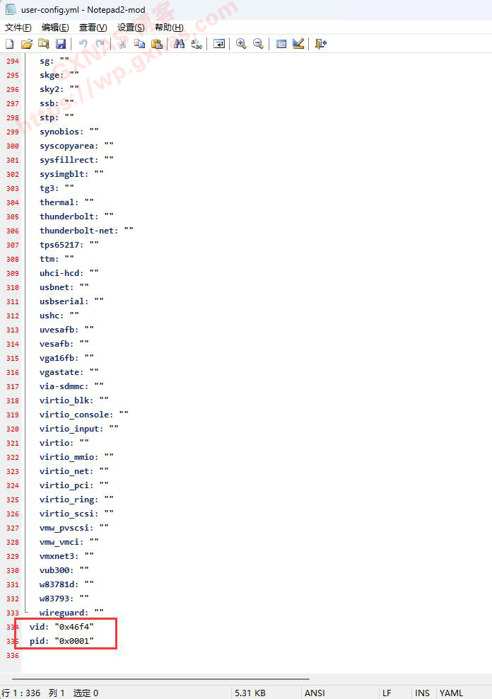 17、用Notepad2打开user-config.yml文件,拉到文件最尾部,找到vid和pid这两行;