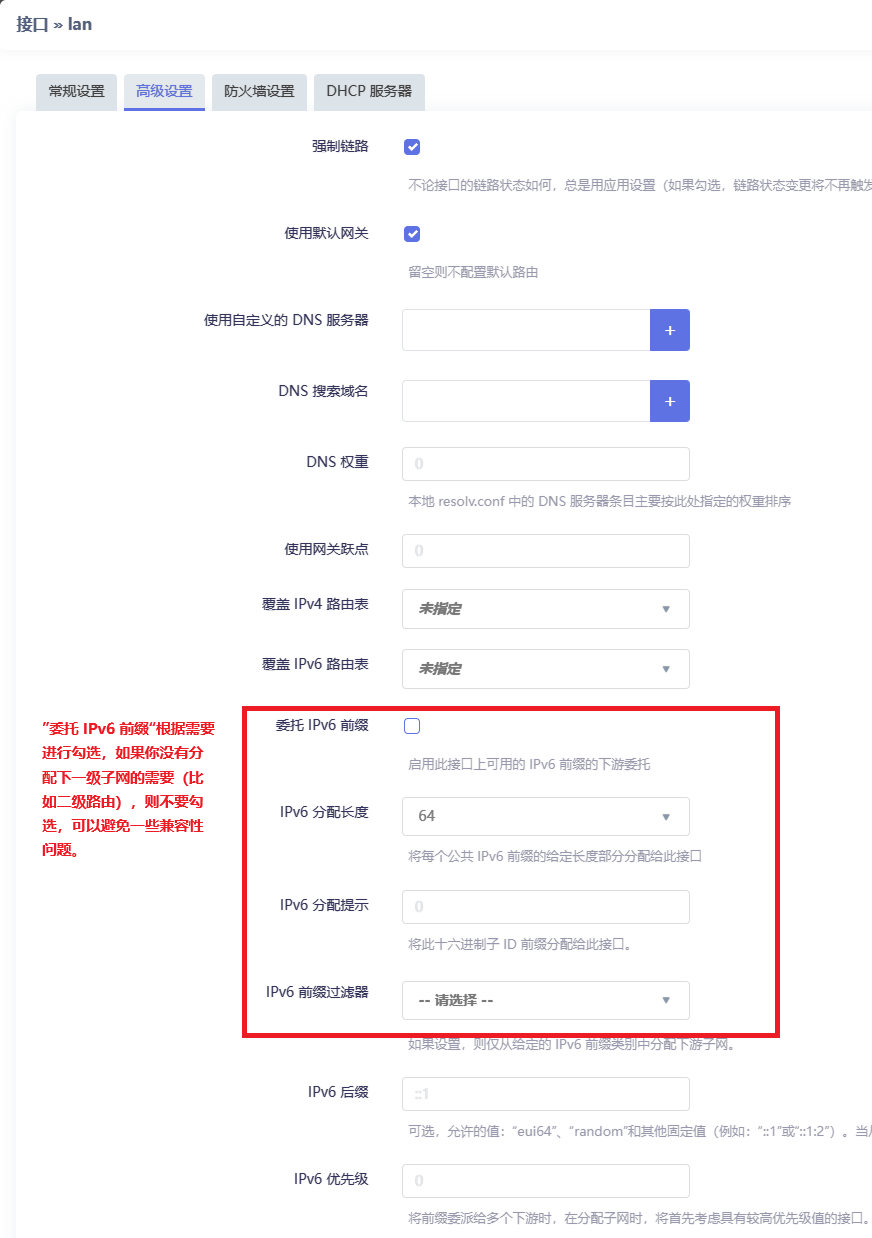 “委托 IPv6 前缀”允许下级设备再划分子网,按需勾选。