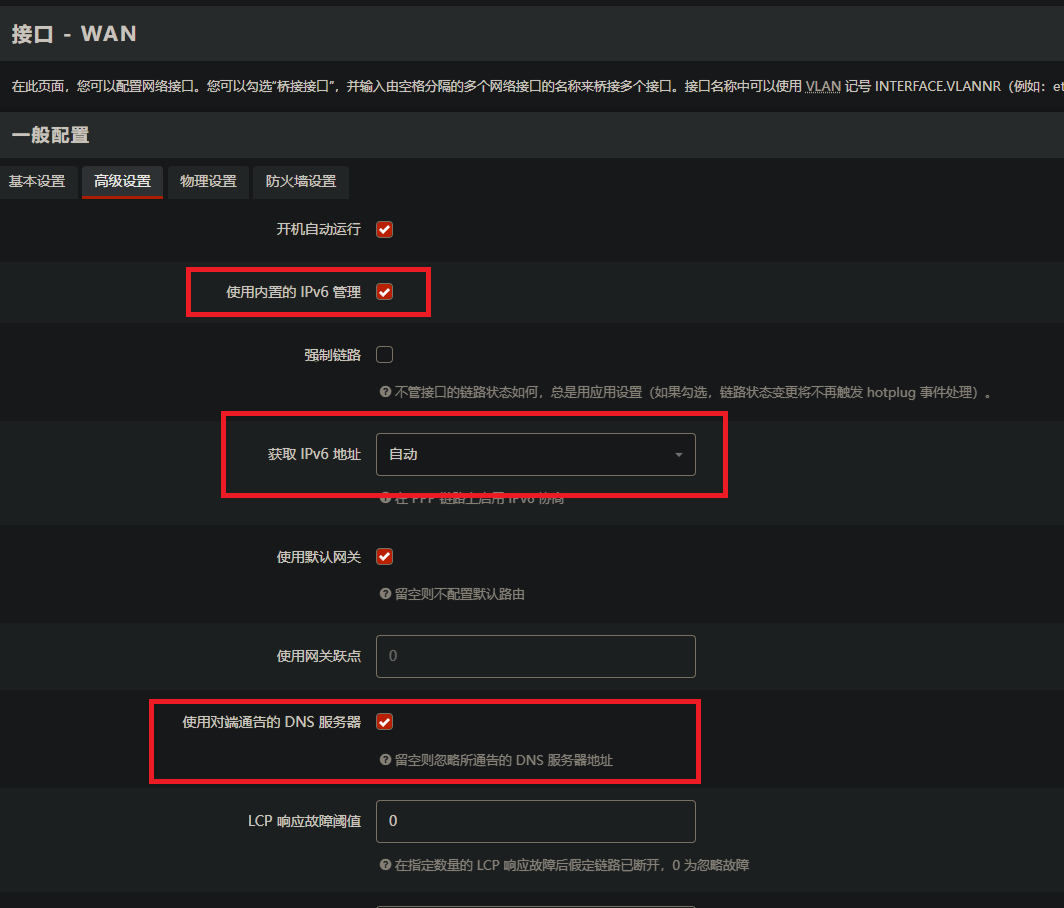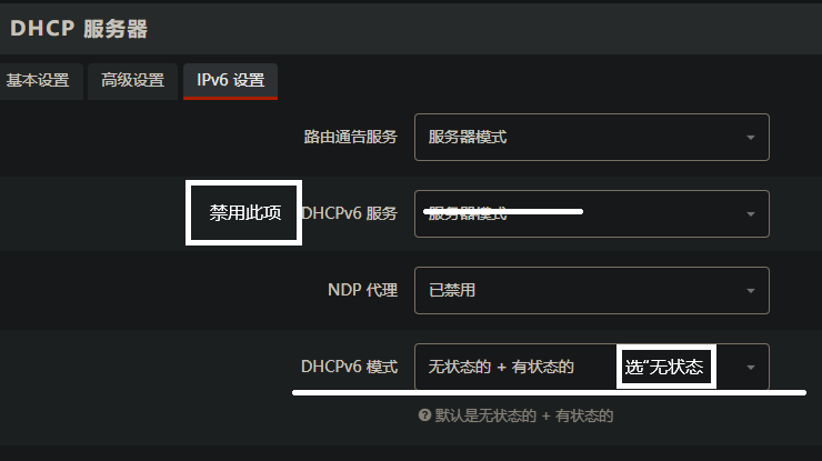 WAN 接口的DHCP中检查设置,确保DHCP > IPv6 设置已经关闭