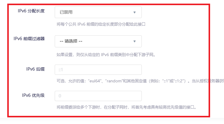 委托 IPv6 前缀(启用的话 lan 是没有 IPv6 地址的)。IPv6 首选项不要填,填了会获取不到地址的。按图设置。