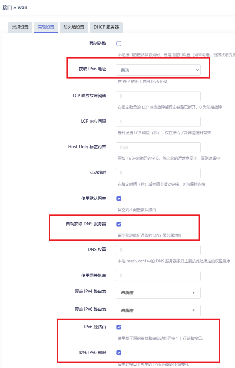 WAN > 高级设置 > 获取 IPv6 地址 WAN > 高级设置 > IPv6 源路由 WAN > 高级设置 > 委托 IPv6 前缀 WAN > 高级设置 > IPv6 分配长度