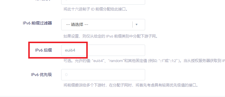 所以此处关闭 DHCPv6,启用 SLACC,并使用 eui64 参数来启用 EUI-64 网络地址分配方式,从而形成固定 IP。