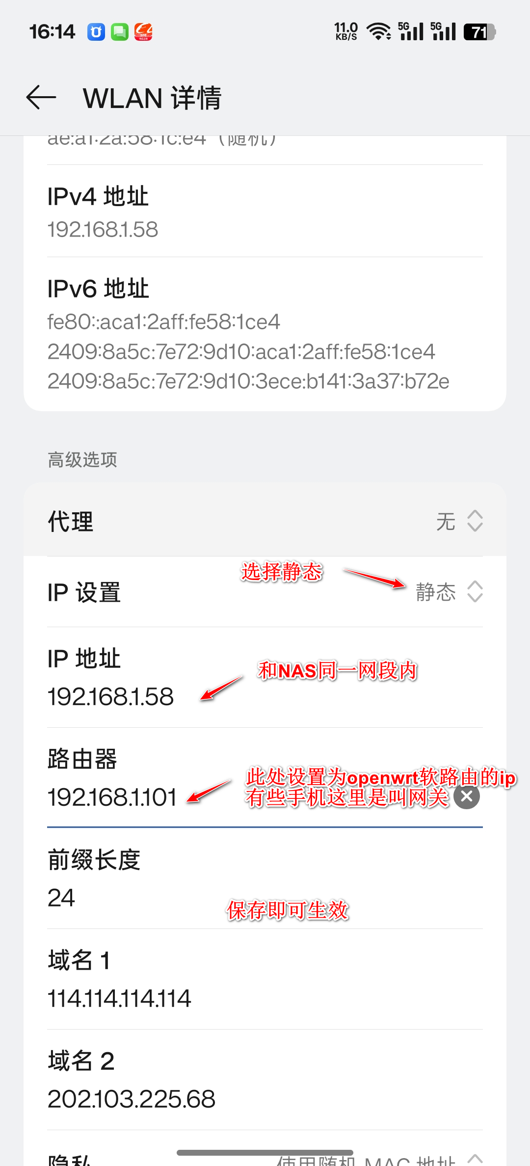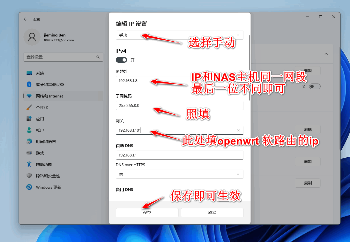 我们的NAS主机是布署了M法上网,只要简单的把要M法上网的设备网关地址 改为 软路由的IP地址即可