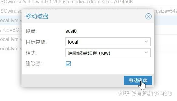 然后在虚拟机的“硬件”处,将磁盘移动到local分区,格式选择raw,勾选删除源。