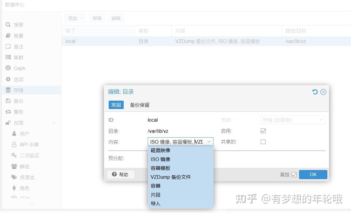 PVE默认会有两个分区,这两个分区可以理解为PVE对不同类型的文件进行分类管理。对于我目前的使用情况来说,local分区也就用来存储一些ISO镜像,local-lvm分区则是用来存放虚拟机磁盘,所以其实就没有必要划分为两个分区了。
