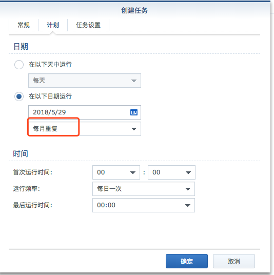 设置计划的时间和周期,这里只支持按月或者年重复,我们只能取按月重复才能满足 Let’s Encrypt 至少3个月更新一次的要求: