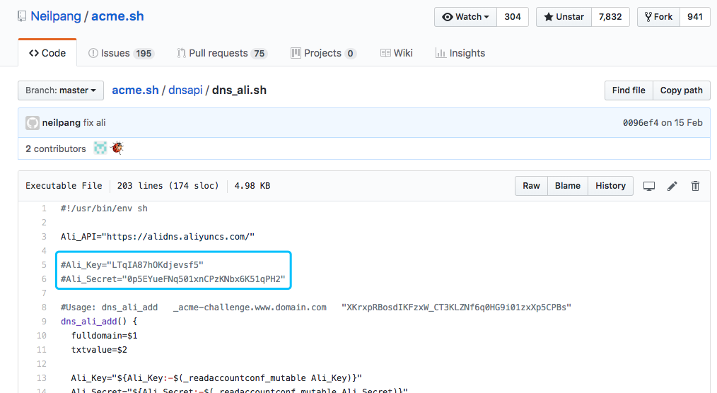 需要指出的是,我给出的配置文件模板并没有给出所有acme.sh支持的域名服务商,大家可以参照 https://github.com/Neilpang/acme.sh/tree/master/dnsapi来添加自己的配置。一般情况下,这个页面每个文件对应一个域名服务商,比如dns_ali.sh就是对应阿里云,文件名去掉.sh扩展名就是DNS类型,比如阿里云的DNS类型就是dns_ali。打开对应文件, 一般都可以在文件的头部找到需要设置的授权信息对应的密钥,比如阿里云的授权密钥所在的位置如下图所示: