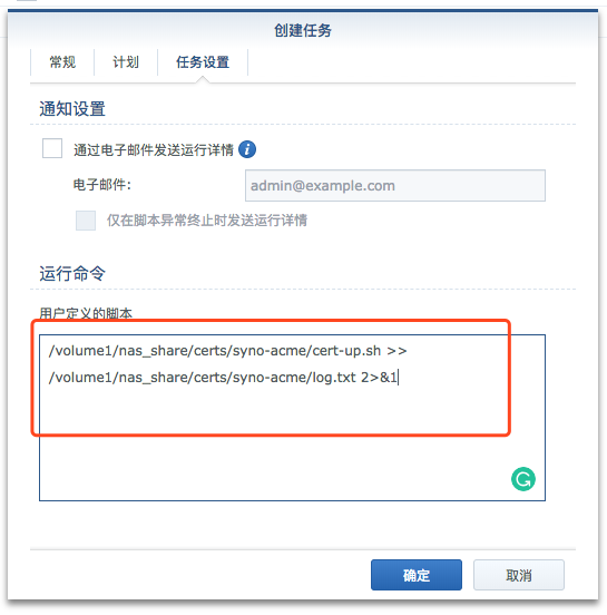 这样脚本就会运行,自动更新证书,并重启web服务器加载新的脚本。以后,NAS会每隔一个月执行一次该脚本,自动更新证书。