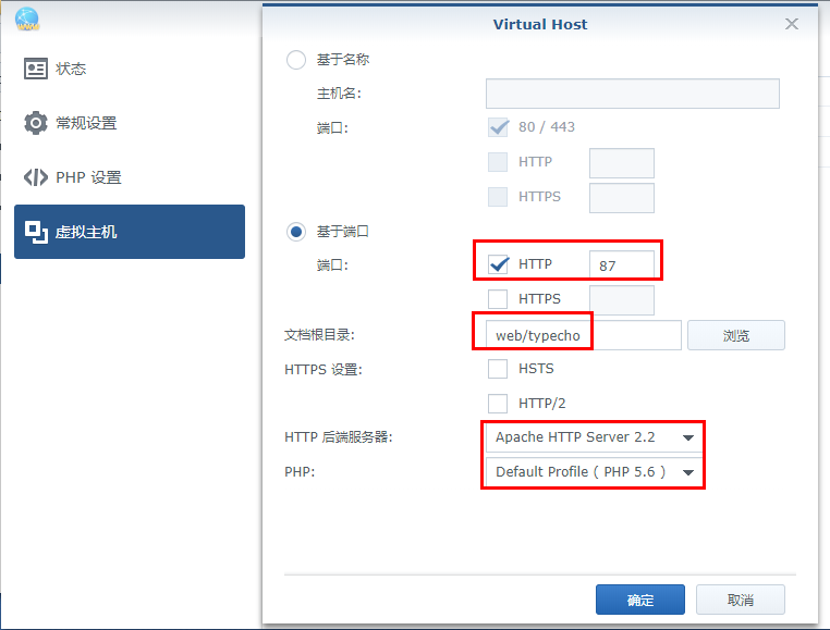5、打开Web Station套件,在“虚拟主机”新增,根据自己的情况设置好端口或者域名(本文用的是端口,有域名的可以设置二级域名,比如:ty.xxx.com),文档根目录设置到web文件夹下的typecho文件夹,如果域名有证书可以把https设置的两个选项全部勾选,http后端服务器和php选上我们安装的Apache HTTP Server 2.2和PHP 5.6。
