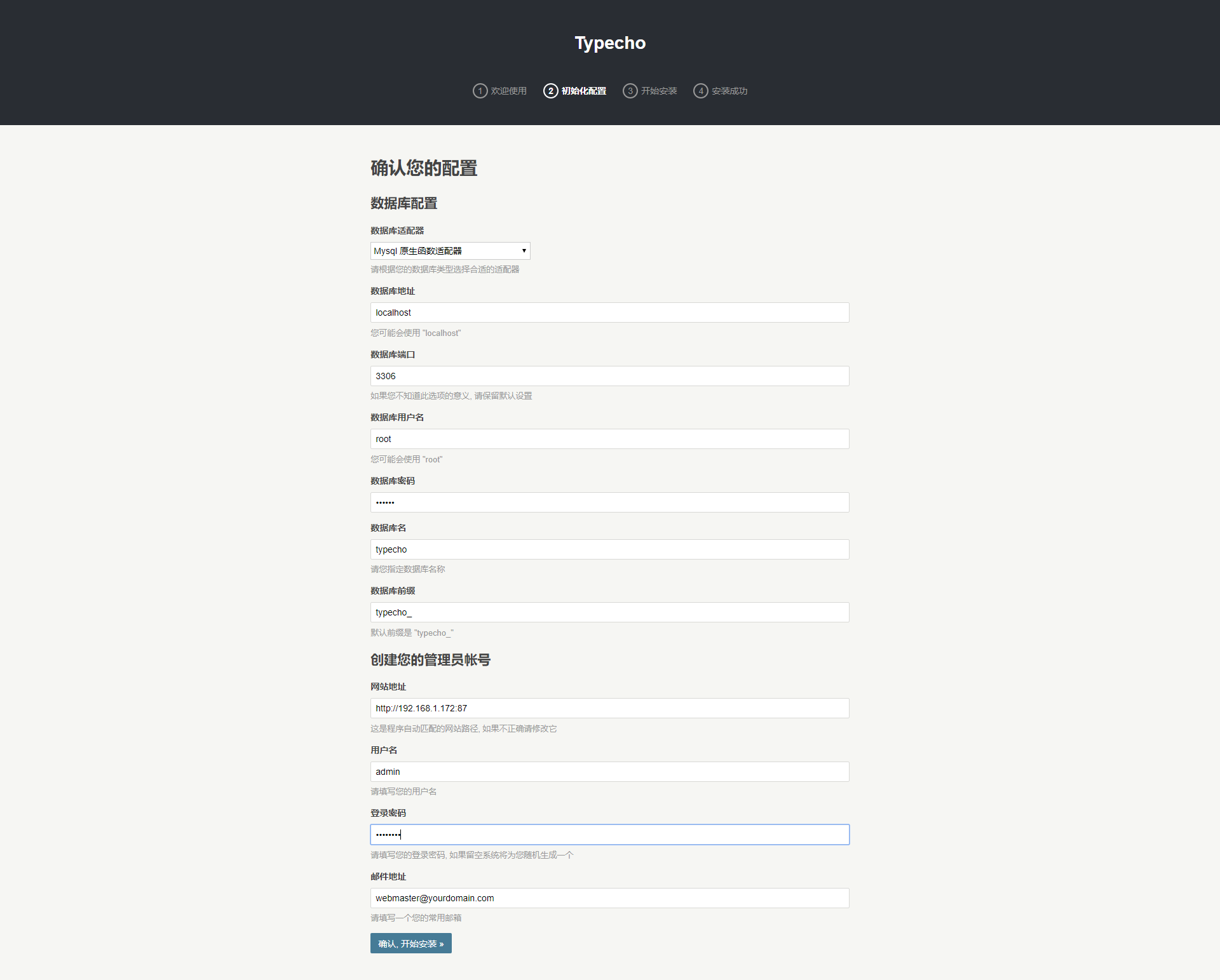 2、请确认安装界面上的数据库名是刚才我们新建的typecho,输入数据库的用户名root及密码,并设置管理用户名、密码和邮箱,点“确认,开始安装”。